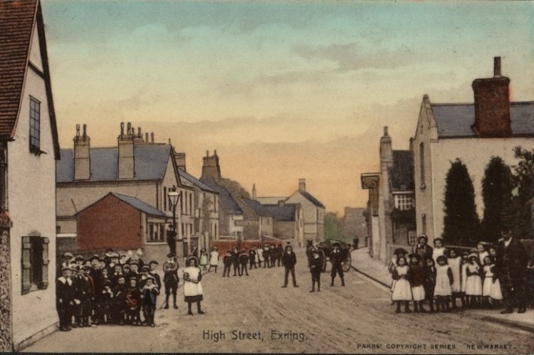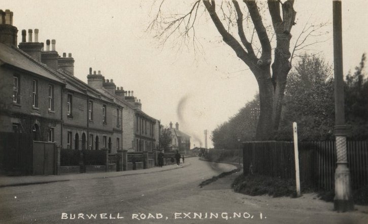 Bottom of Burwell Road, looking much the same as today, except for steam engine coming round the top corner. |