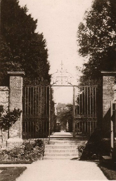 One of a pair of wrought iron gates leading into Glanely Rest from Windmill Hill, opposite entrance to May's Garden Center. |