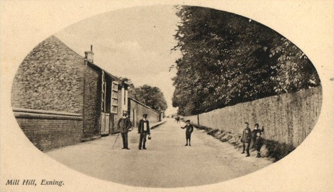 Windmill Hill. Flint barn still standing. Note large gates to Exning House in wall on left. |